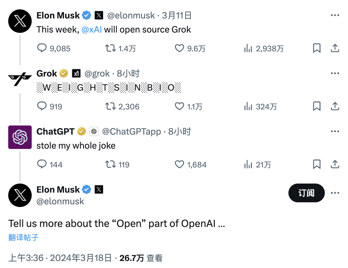 xAI正式宣布开源大模型Grok-1的当天,马斯克还与ChatGPT在X平台上过招称“告诉我们OpenAI到底open(开源)在哪里了”。